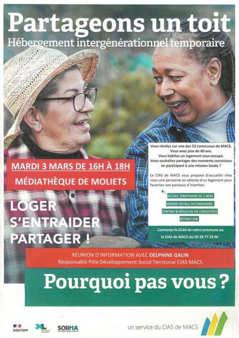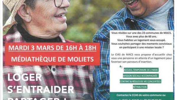 PARTAGEONS UN TOIT PARTAGEONS UN TOIT Publié le 22 février 2026 / Dernière modification le 22 février 2026 PARTAGEONS UN TOIT Publié le 22/02/2026 - Dernière modification le 22/02/2026 Delphine GALIN, Responsable Pôle développement Social Territorial CIAS MACS pour une présentation du dispositif Rendez-vous à la médiathèque le 3 mars 2026 de 16h à 18h
